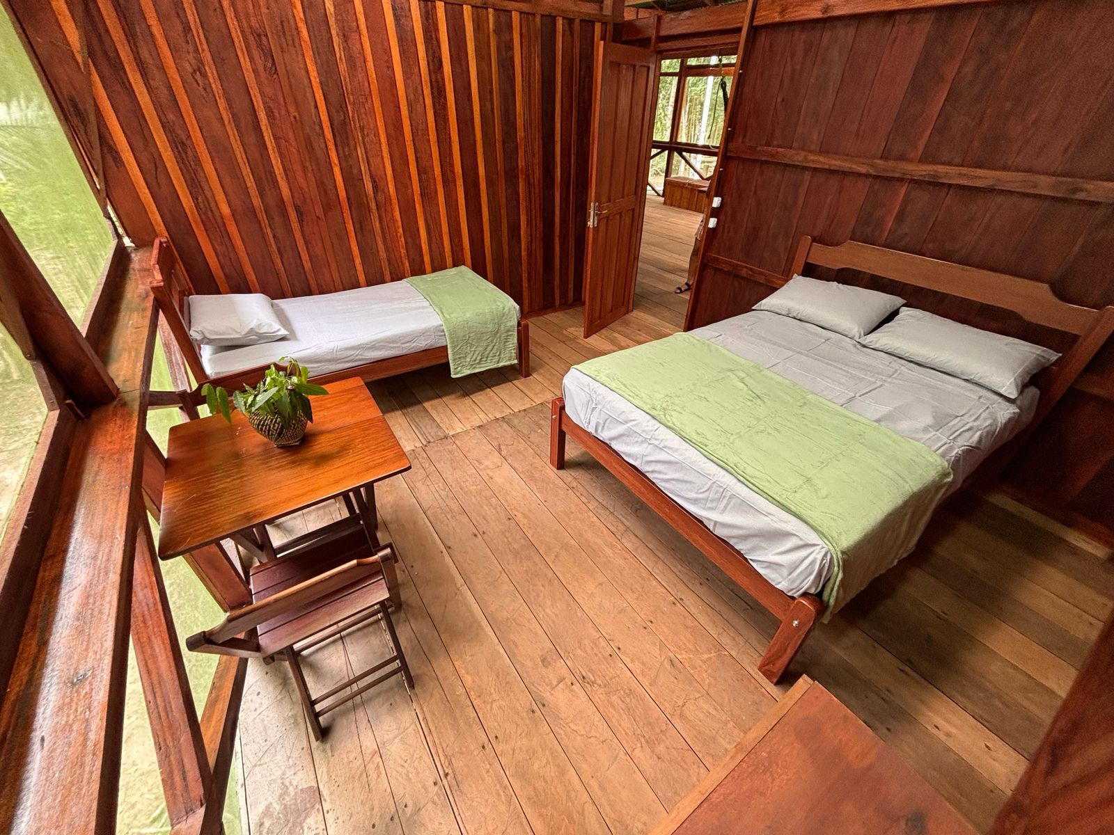 Our guests enjoy the comfort of private rooms equipped with either double or single beds, ensuring a restful night's sleep after a day of adventure. Each room features ceiling fans to keep you cool in the tropical climate, while the screened walls allow the gentle forest breeze to flow through, creating a natural and comfortable sleeping environment.