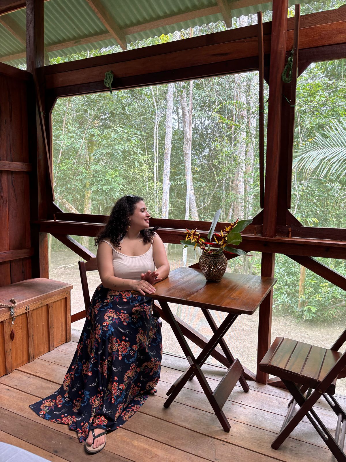 The lodge is fully powered by electricity and offers internet access points, ensuring modern convenience amidst nature. The dining area is cozy and functional, with comfortable tables and chairs, as well as a veranda with lounge chairs — perfect for relaxing or meditating while contemplating the Amazon landscape. The kitchen and bar are integrated with the restaurant, providing easy access and turning meals into special moments of interaction.